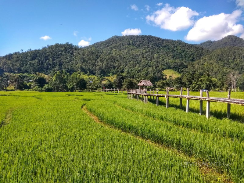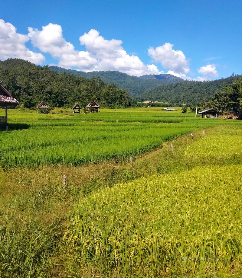 Есть только один нюанс: место выглядит вот так шикарно только пока зреет рис. Когда его собирают, а потом жгут поля, то картинка будет совершенно не впечатляющая. Вот почему рекомендую заехать сюда, но только если вы окажетесь в Пае где-то в сентябре-ноябре.