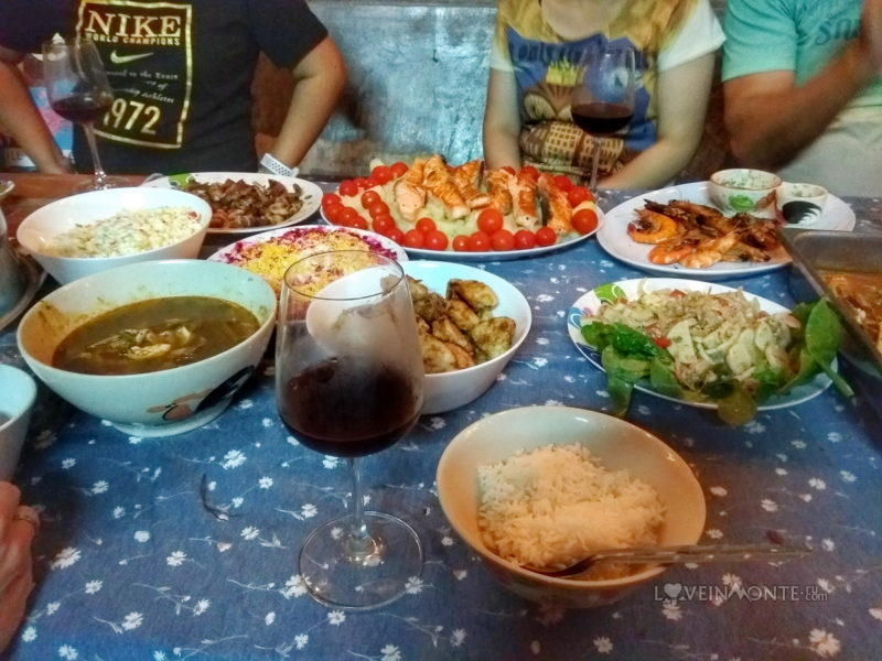 Вечером нас позвали в гости к хозяевам нашего жилья, так вот на фоне стандартных тайских блюд всё это выглядело просто супер празднично. На большом блюде лежала просто отварная картошка, сверху я положила стейки из лосося, а по краям набросала помидорчиков черри.