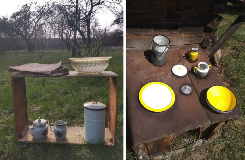 Помимо столов на фото много хенд-мейда: полуавтоматический водопровод, Сашин дебют) Карниз из ветки; светильник из старой терки, которую я нашла в сарае; полочки из деревях, которые мама привезла нам на разделочные доски. В целом всё это сложилось в какой-то интересный ансамбль.