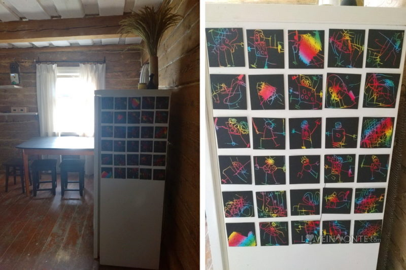 Не успели до отъезда отправить холодильник на свое законное место, пока так и стоит в комнате. Над его украшением поработал Лёва.