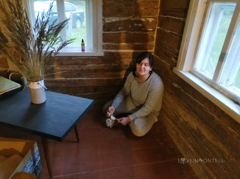 Я начиталась про технологию «теплый шов», постепенно заделали все дыры между бревен и замазали их герметиком для срубов.