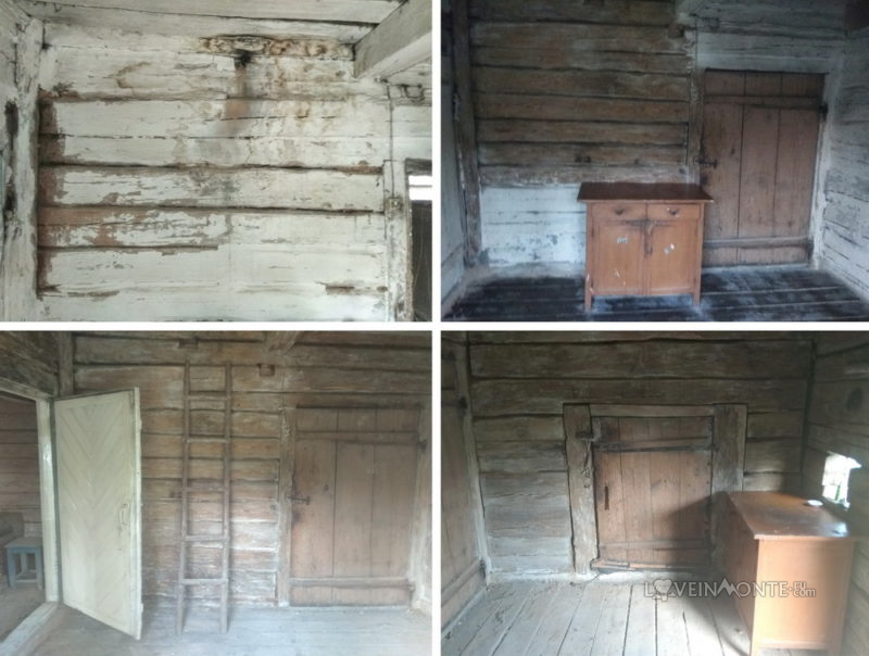 Вот тут можно почитать о том, как у нас появился этот дом в лесу. Он достался нам в достаточно грустном состоянии. Комната была будто бы разделена на две обоями разных цветов, странной полуперегородкой и дверью за печкой, которая никуда не вела. Вся прекрасная фактура старого дома была надёжно спрятана под слоями обоев. Даже красивенные балки на потолке.