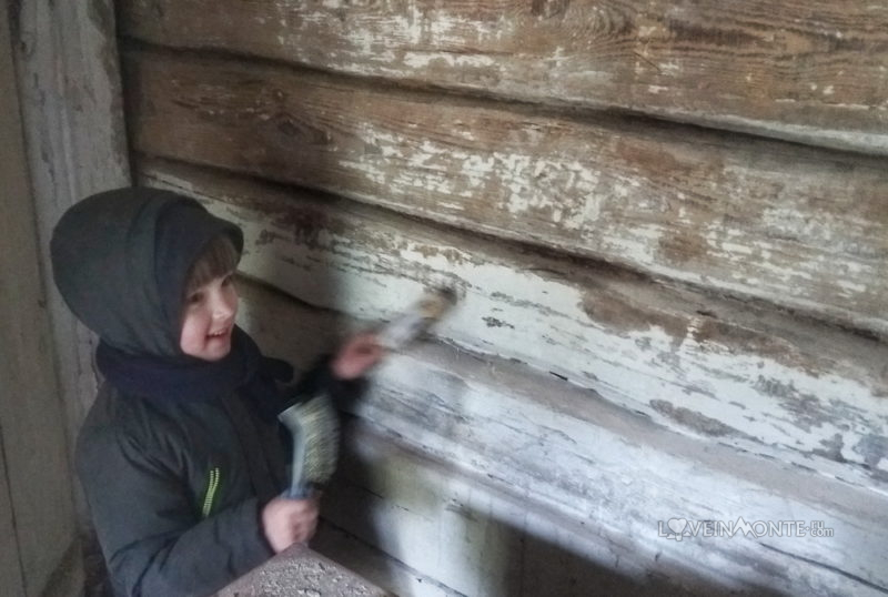 Когда мы только начали сдирать лишнее со стен — думали, что дальше чем-то их зашьем. То один вариант рассматривали, то другой. Всё было не то, пока не дошло, что деревянные стены красивы сами по себе. С того момента нас ждал месяц ооочень пыльных работ в респираторах. Саша шлифовал болгарочкой в комнате.
