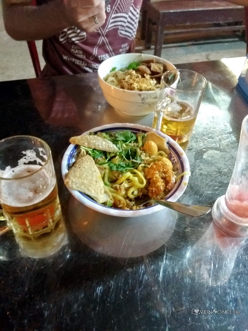 Мы пробовали Mì Quảng и Cao Lau, оба представляют собой огромную супницу-салатник, где вы найдете: лапшу, какой-то белок (это может быть курица, свинина, говядина, морепродукты, яйцо), кучу зелени, орешки, интересный соус (на дне чаши, обязательно перед употреблением перемешайте) и хрустящие чипсы.