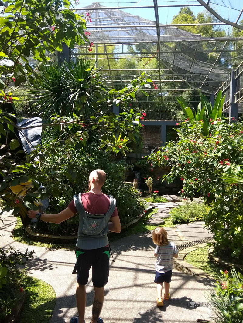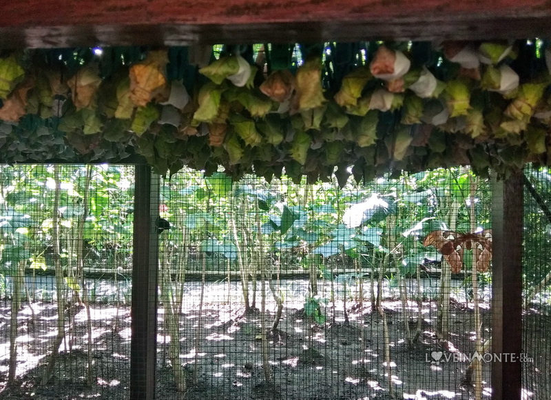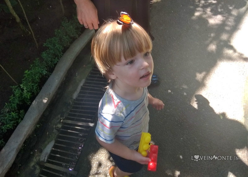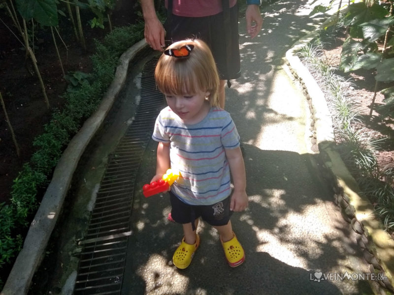 И попадете в сам парк. Это открытое пространство, но наверху натянута сетка — и бабочки в больших количествах летают и садятся всюду.