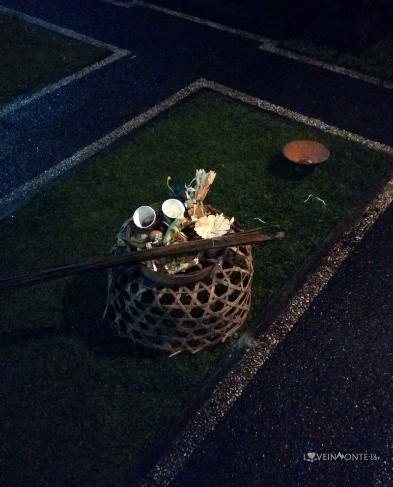В этот день подношения у дома гораздо шикарнее и масштабнее, чем в другие дни. Возле каждого дома — вот такие установки. А прутья — поджигаются.
