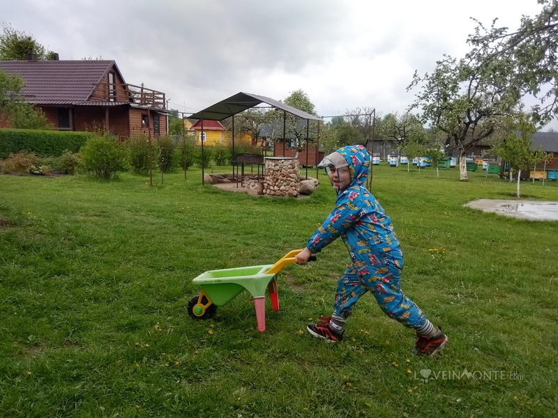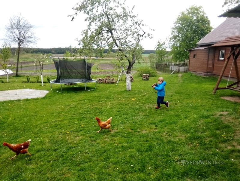 По территории бегают курочки. Лёва гонялся за ними с деревянными пушками.