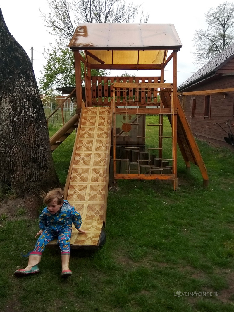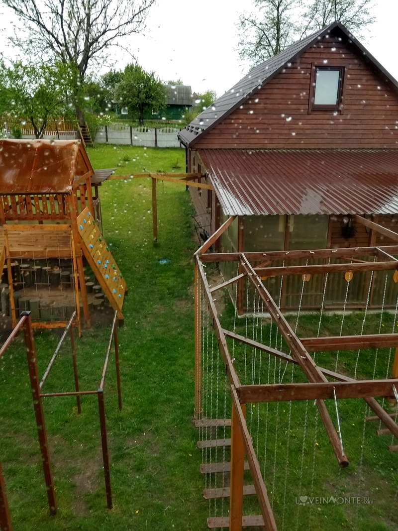 Оттуда вот такой вид на площадку и наш домик. И на дождь)