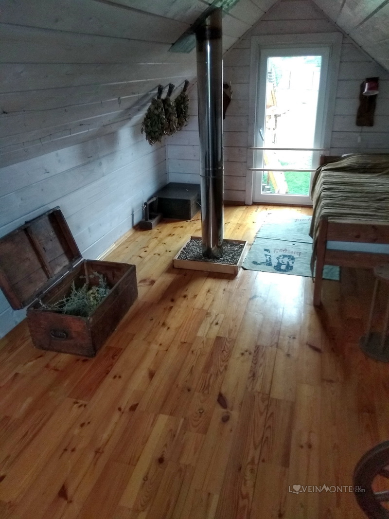 Она представляет собой небольшое двухэтажное здание за нашим домом. На первом этаже — парилка и комната отдыха с камином.