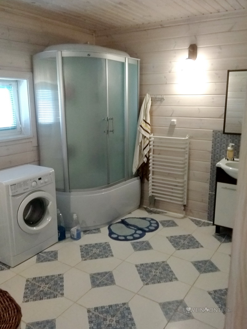 В ней теплый пол, есть душевая кабина и стиральная машина. Хозяева заботливо поставили рядом с ней средство для стирки и кондиционер. Так приятно.