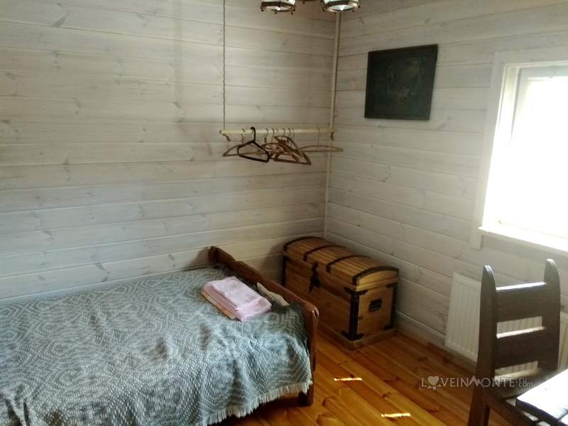 Двухэтажный, с тремя спальнями. Одна из них на первом этаже, с 1 двуспальной кроватью, сундуком и рабочим столом.