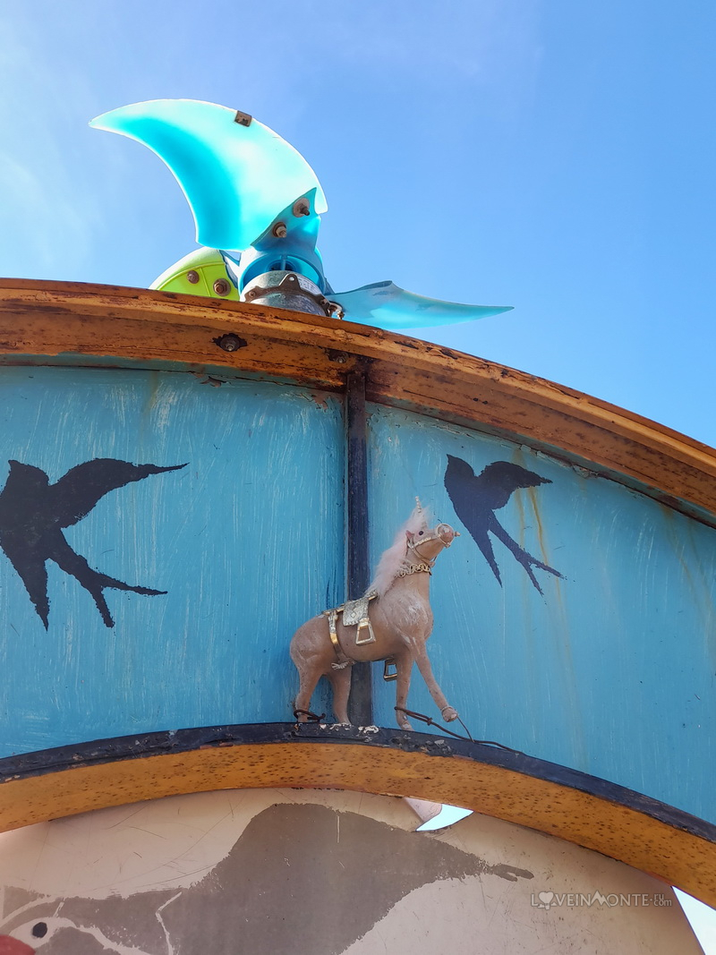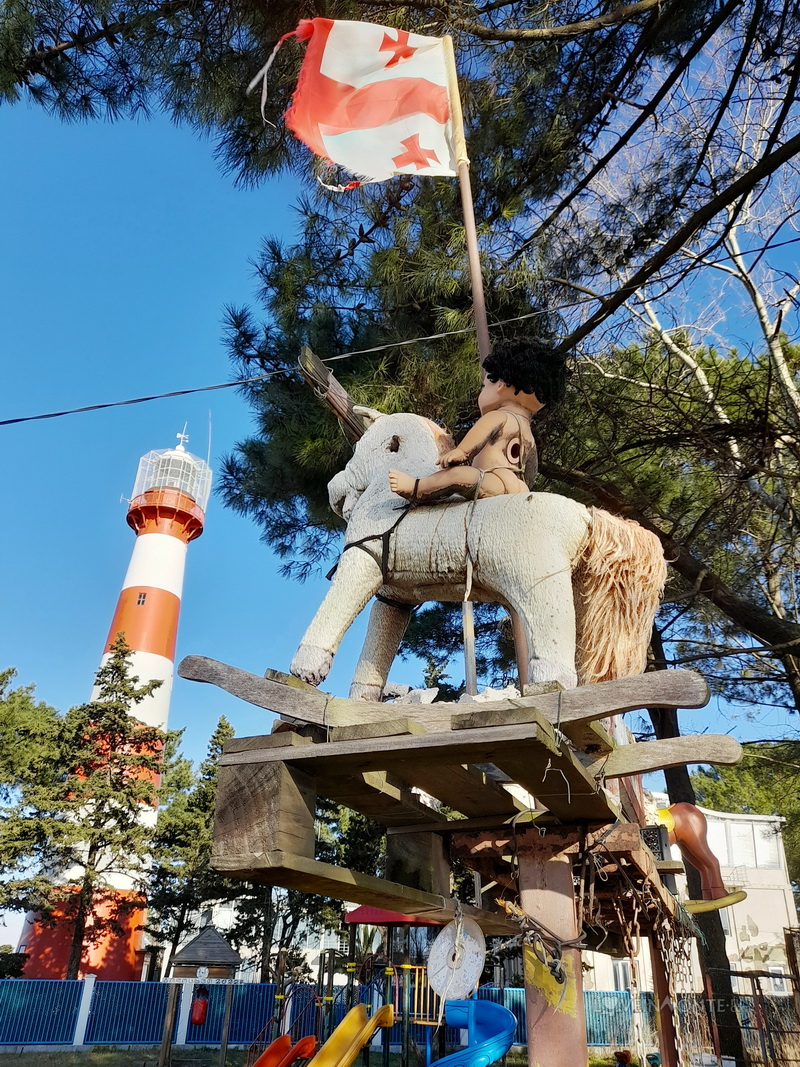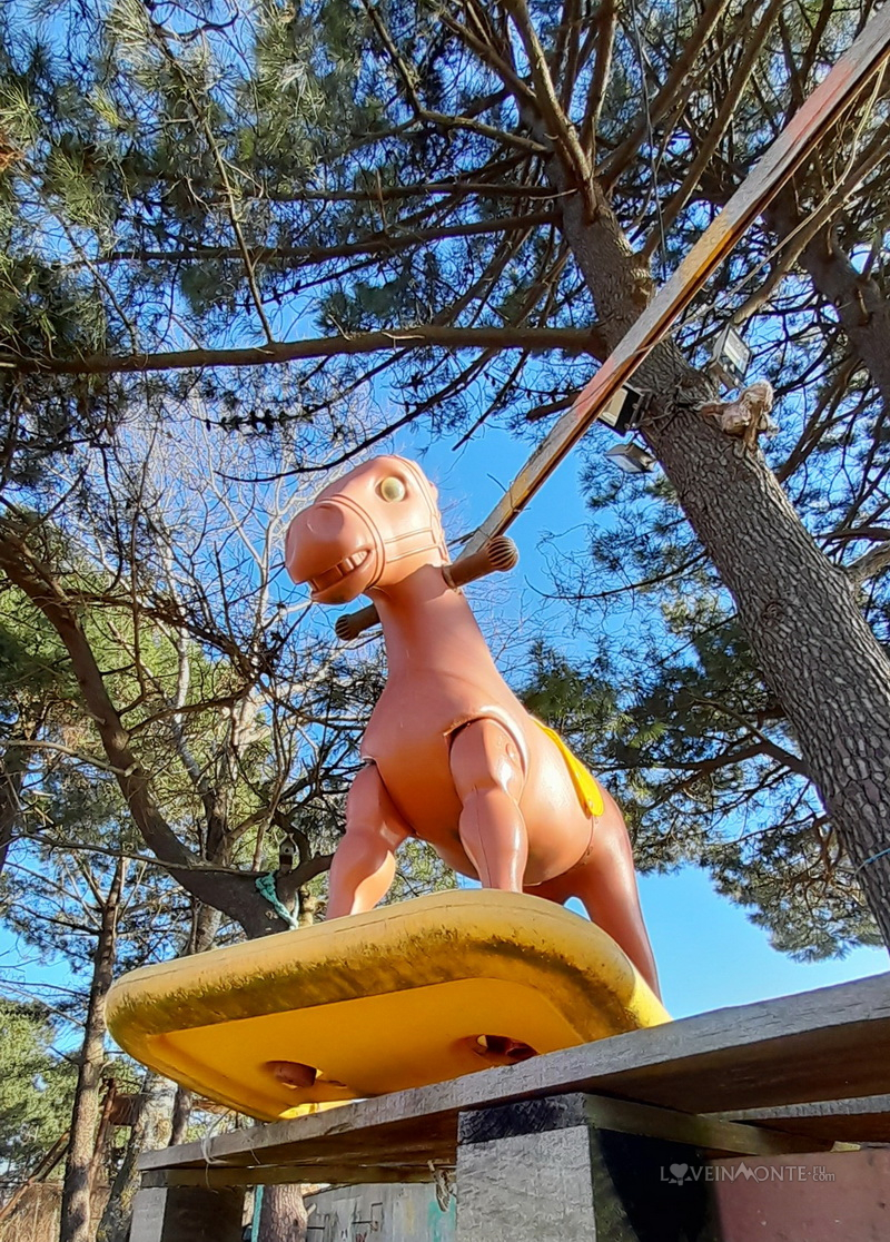 Рядом с всё тем же маяком есть десткая плошадка, которая оставляет больше вопросов, чем ответов. Там много выцветших и поломанных игрушек, которые могли бы служить отличными декорациями к фильму ужасов. Но Лёве понравилось: на всём покатался, всё покрутил)