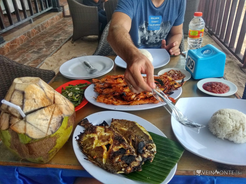 Всё, что на фото, обошлось нам ровно в 300 000 IDR, из них около 180 000 — на морепродукты (пол килограмма гребешков, какая-то неизвестная рыба и почти килограмм креветок), и 120 000 — готовка, рис, самбал, овощи и напитки. Более чем адекватно. Не могу сказать, что это было самое вкусное в жизни, но очень-очень неплохо.