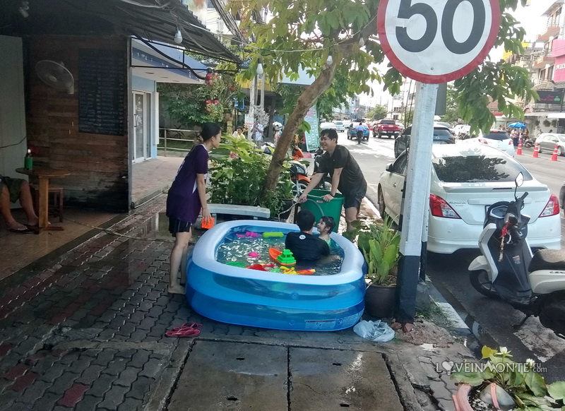 Пошли в салон связи, купить тайскую сим-карту. Пока оформляли, зашел какой-то странный дядечка с водным пистолетом и стал всё поливать (и сотрудников, и телефоны, и компьютеры). Все смеются, всем весело. Подумали, что это городской сумасшедший, оказалось — их директор)