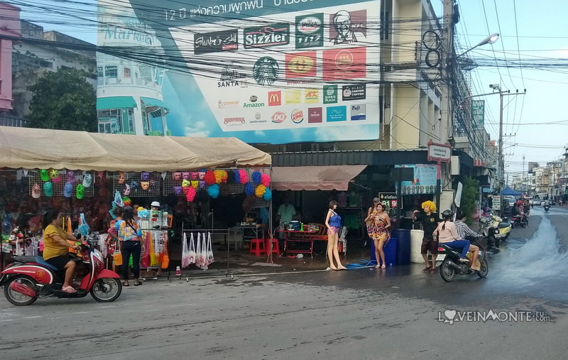Если вы еще не в курсе, что он из себя представляет, то я немножко расскажу. Тайский Новый год празднуется не за праздничным столом, без ёлки, оливье и мандаринов. Наоборот, люди выходят на улицы и обливают всех знакомых и незнакомых водой, тем самым желая счастья. Чем больше воды, тем больше счастья)) И еще мажут прохожим лица и тела цветным тальком, с той же целью.